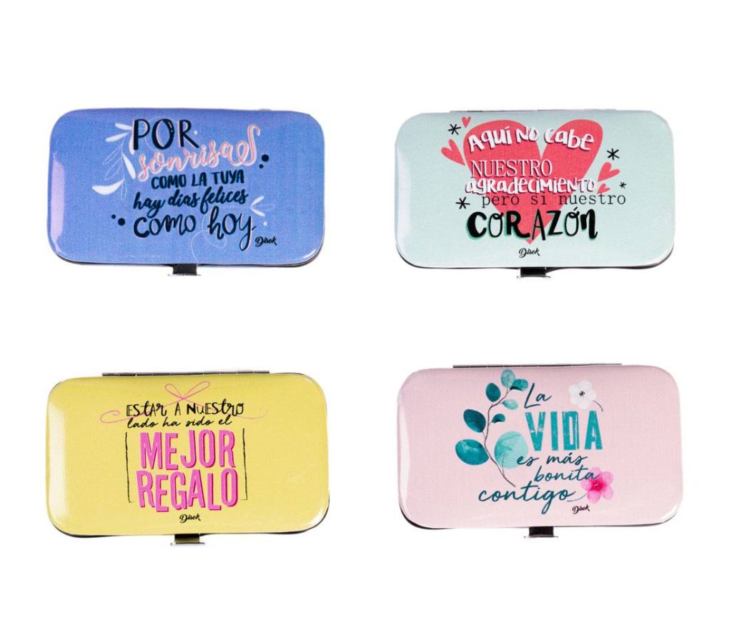 Completo set de manicura con 4 diseños de frases surtidas. Precio unitario.